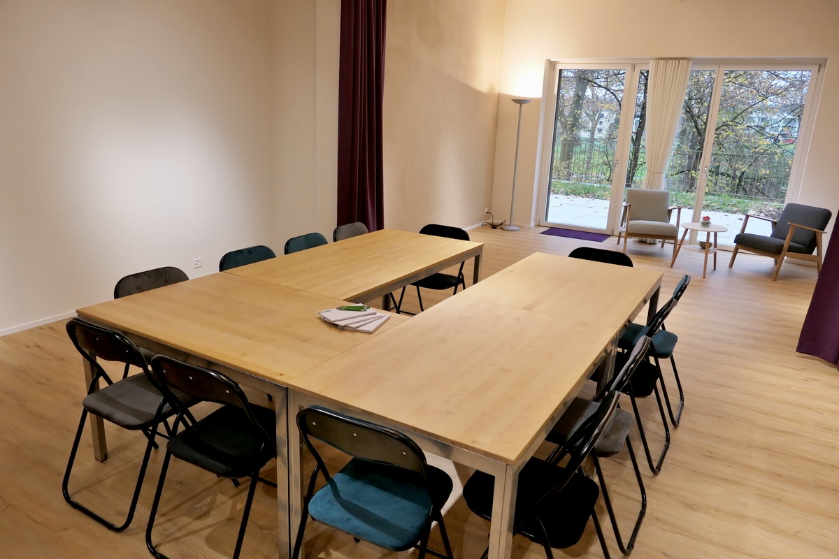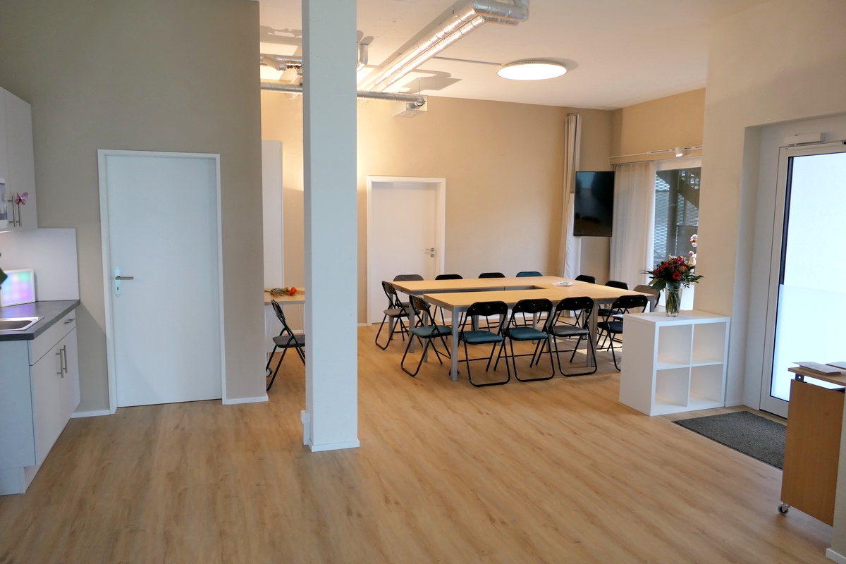 Grosszügiger Raum (60m2), professionelle Physio- und Massageliege, Tische, 50 Stühle, Flipchart, Musikanlage und Stauraum bei Bedarf.